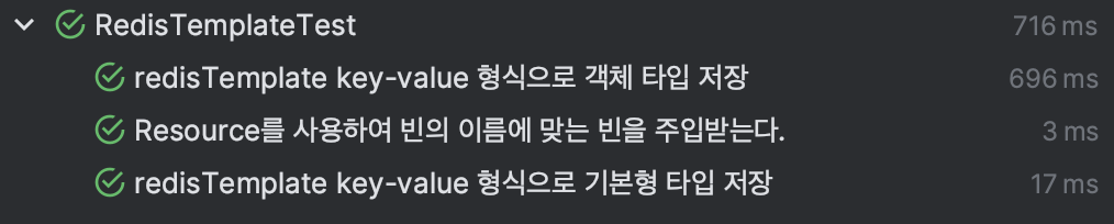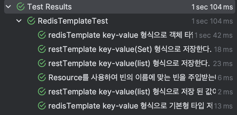 Spring Data Redis는 Key-Value 구조의 자료구조만 사용하기 때문에 다른 자료구조도 테스트 해보기 위하여 RedisTemplate를 직접 만들어서 학습 테스트를 진행해봤습니다. redisTemplate.opsForValue(); 를 사용하여 key-value 자료구조에 대해서 Primitive Type, Reference Type 두 경우에 대해서 테스트를 진행해보고자 하였습니다. @DisplayName("redisTemplate key-value 형식으로 기본형 타입 저장") @Test void saveValueOpsPrimitiveType() { // given ValueOperations stringObjectValueOperations = redisTemplate.opsForVa..