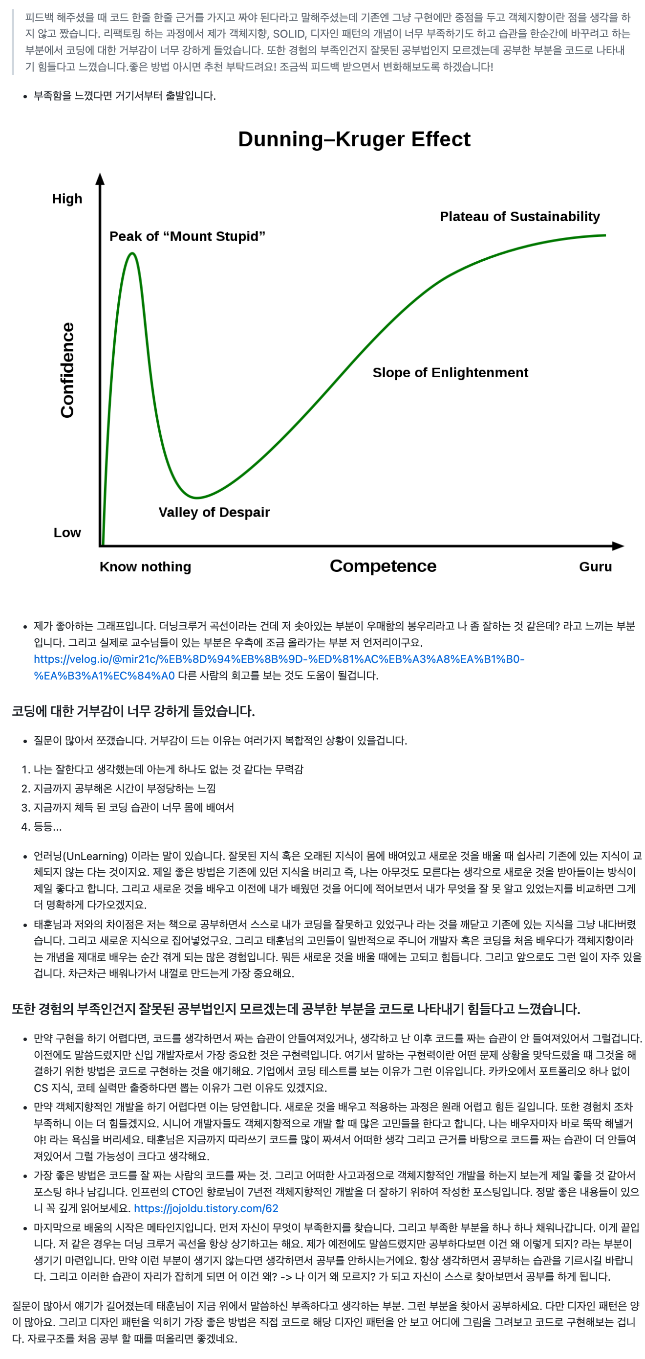 따라서, 후배들에게도 "코드 한 줄을 작성 할 때 자신의 생각을 담아서 코드를 작성해봤으면 좋겠어. 그래야 내가 무슨 질문을 했을 때 그걸 답 할 수 있는 근거가 될거야." 라는 말을 전달을 해주었다. 이는 아마도 학부 시절 경험했던 나의 근거없는 코드 짜는 것에 대한 자기 혐오 였을 수도 있을 것 같다.