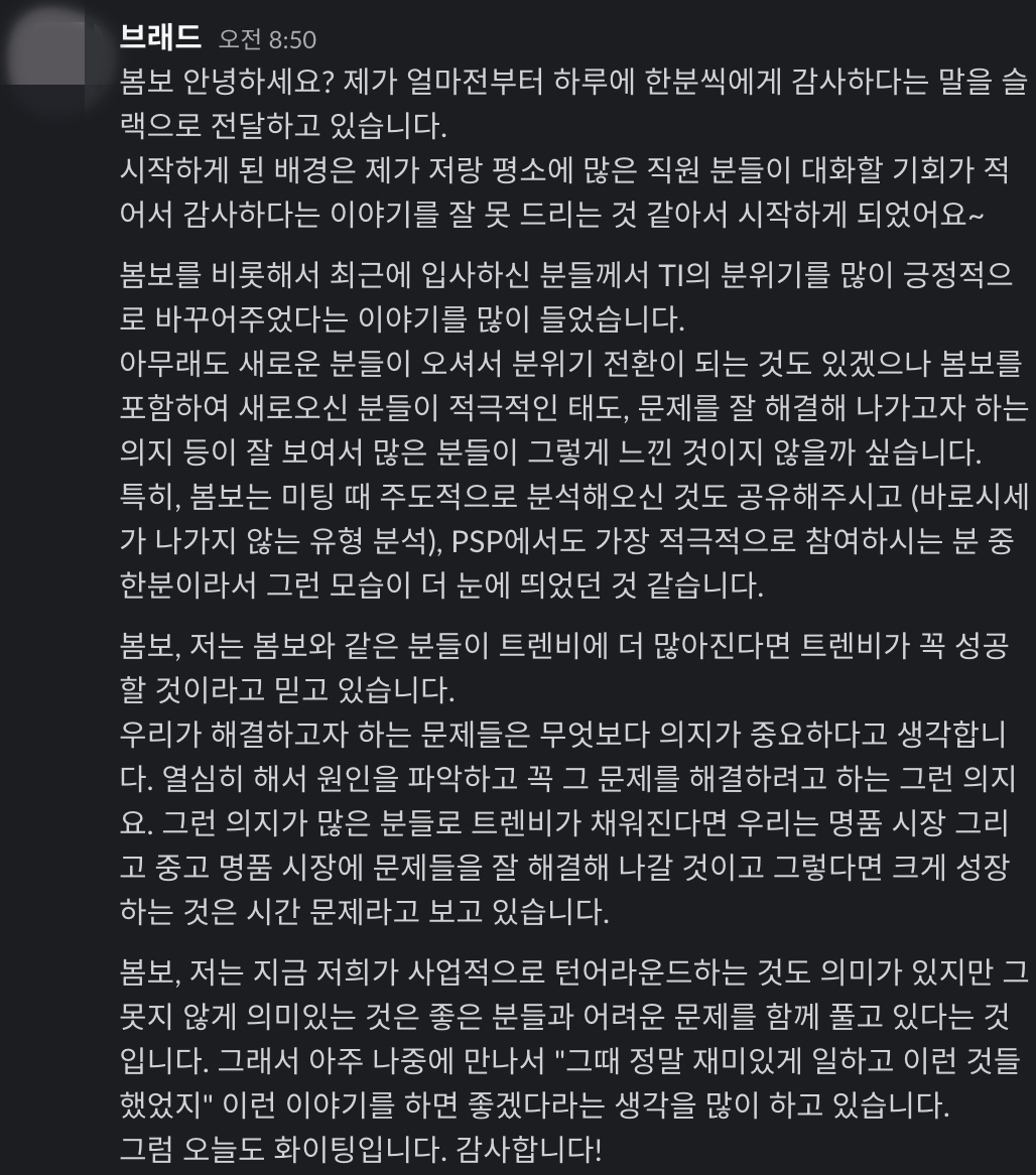 다행히도, CTO 자리가 공석이 된 후 우리 팀의 팀장님이 그 자리를 맡으시게 되었다. 팀장님은 뛰어난 능력과 매니징 스킬을 갖춘 분이었기에, 그로 인해 불안감이 조금은 덜해졌다.