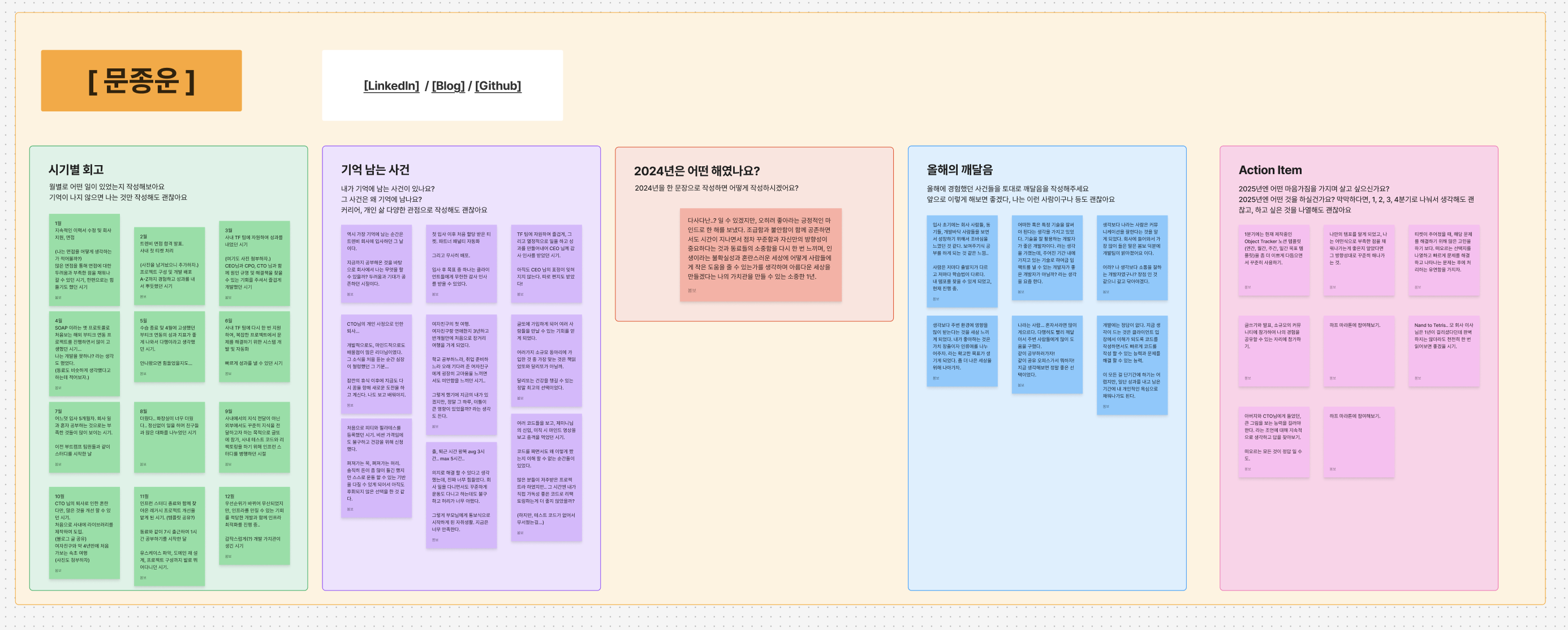 어느덧 2024년이 저물어 간다. 이 짧은 시간 동안 나는 얼마나 성장했을까? 어떤 일들이 나를 스쳐 갔는지 돌아볼 필요가 있다고 느꼈다. 그래서 인프런 회고 밋업에 참가해 도움을 받기도 했다.