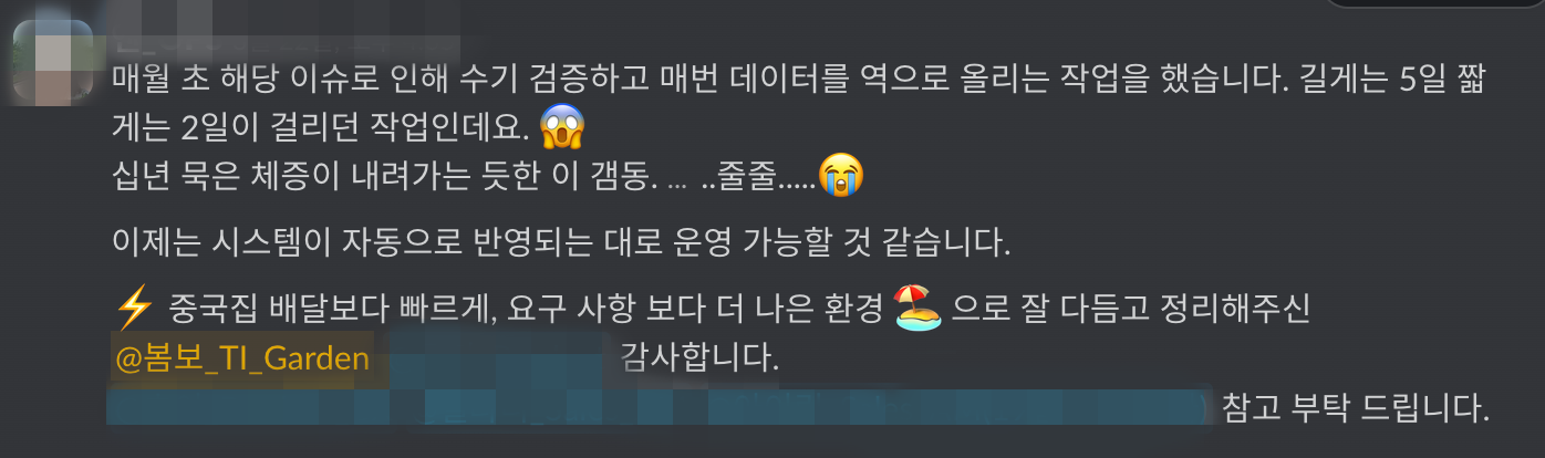 프로젝트 완료 후 운영팀으로부터 감사 인사를 받았는데, 이는 내가 개발자로서 가장 큰 보람을 느끼는 순간 중 하나였다.