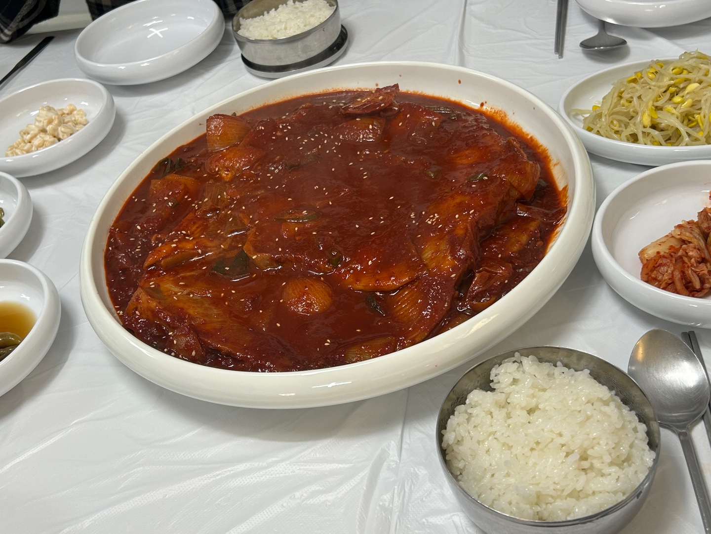 그리고, 도착한 그 음식점에서 한 번도 먹어보지 못한 가오리찜을 먹게 되었다. 세상에... 생선이 이렇게 부드러울 수가 있는가? 결대로 떨어지는 살이며, 약간 매콤하면서도 자극적인 양념은 아직도 너무나도 인상 깊게 남아있다. 생선과 함께 한 그릇... 한 공기를 추가하여 양념장에 반 그릇... 다음에 부모님과 고성을 온다면 꼭 부모님께 대접하고 싶다는 생각이 들만큼 너무나도 맛있는 식사였다.
