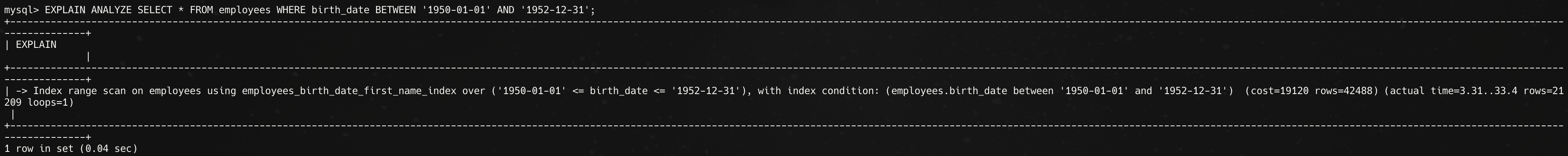특히, 날짜 같은 경우에는 카디널리티가 적당히 높은 수준의 데이터 컬럼이기때문에 birth_date 컬럼을 중점적으로 적절한 수의 데이터를 가지고 와야 합니다. 너무 많은 데이터를 가지고오면 Optimizer가 자체적으로 Table Full Scan을 할 수도 있기 때문입니다.