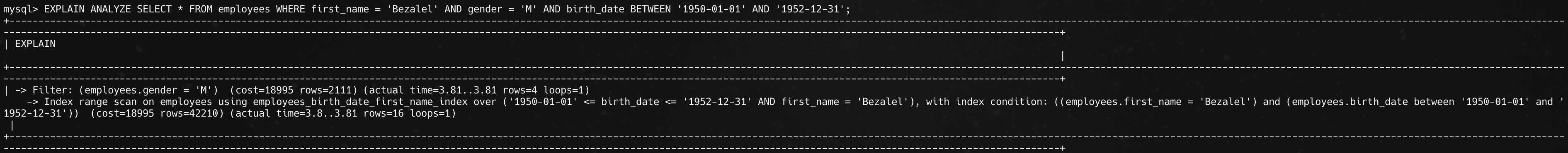 이제, 인덱스 범위 스캔이 이루어지고 있음을 확인 할 수 있습니다. 그럼 이어서, 복합 인덱스를 걸어두었으니 first_name으로 'Bezalel'인 사람을 기존 복합 인덱스 순서대로 조회하여 쿼리 분석을 해보도록 하겠습니다.