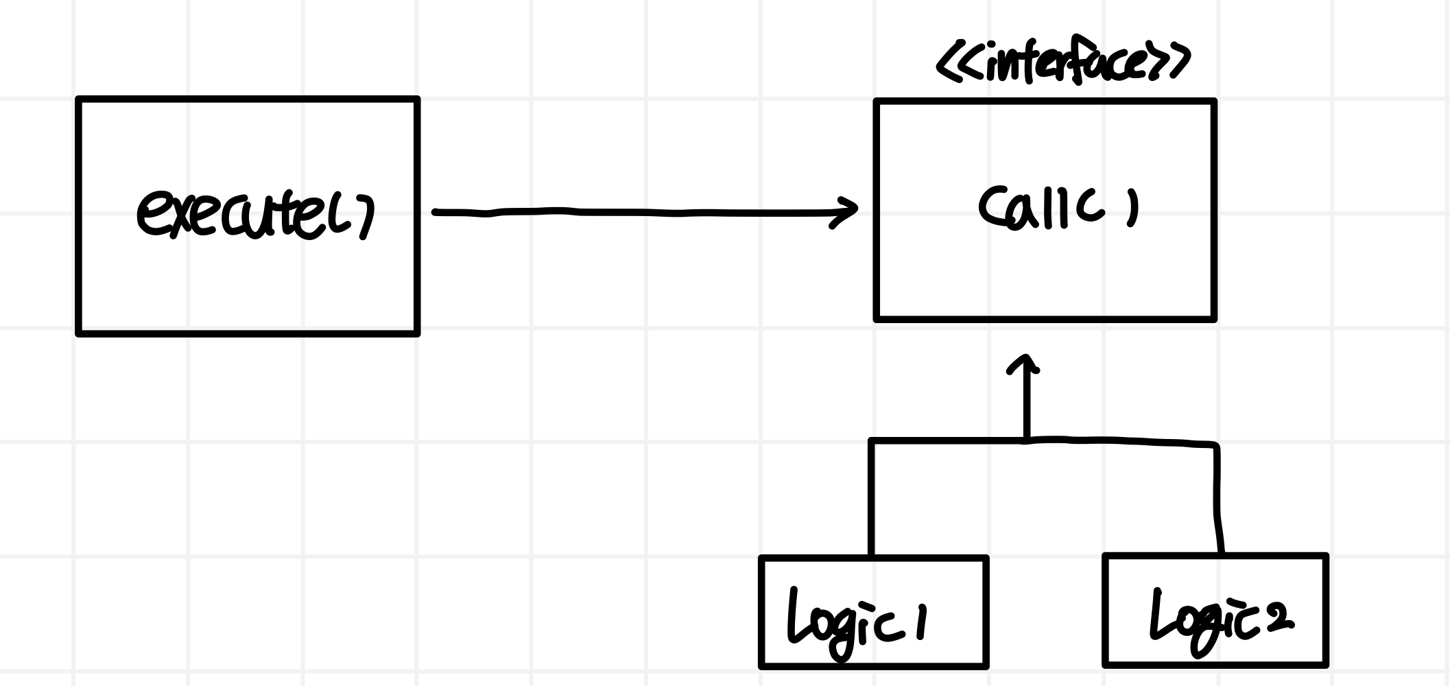 이제는 execute()를 실행하는 클래스가 call()을 실행하는 interface를 구성하여 문제를 해결하는 모습을 볼 수 있고, 추상화 된 인터페이스에 대해 여러 개의 구현체를 가지고 있는 모습을 확인 할 수 있습니다.