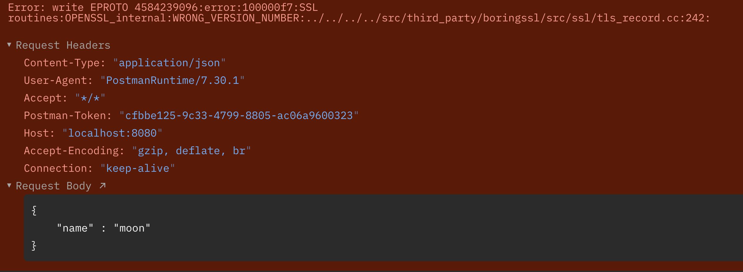 대충 에러를 보면 HTTP 요청헤더에 뭔가 잘못되었다고 하고 HTTP 메서드 이름에서 유효하지 않은 문자가 발견됐다는 것이다. 그리고 토큰화 되어야 한다고 한다. 먼저 헤더부터 살펴봤다.