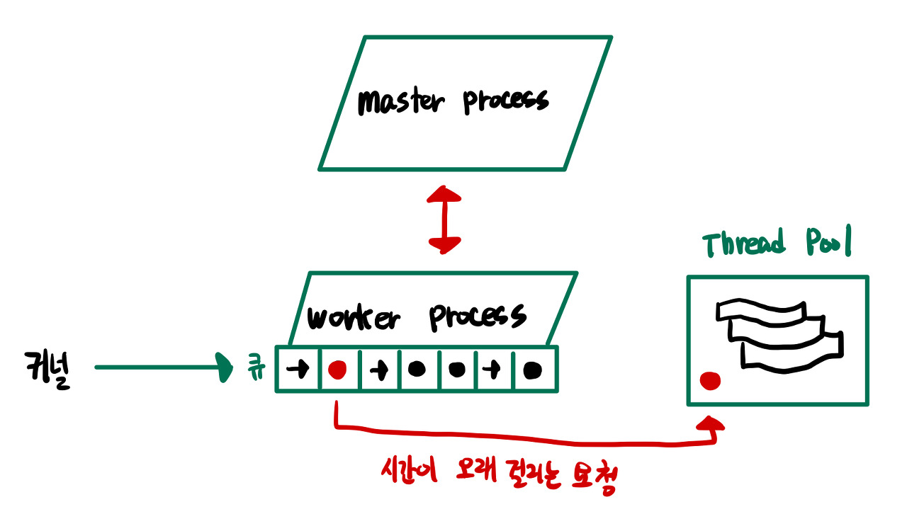 이러한 이벤트들은 OS 커널이 큐 형식으로 워커 프로세스에 전달하고, 각 이벤트들은 비동기 방식으로 대기하면서 수행됩니다. 또 큐에 담긴 요청 중에 하나가 오래 걸려서 호위 효과가 발생하게 되는 상황이 발생될 수 있는데 NGINX는 이러한 상황을 방지하기 위해 스레드 풀을 만드어 놓고 그 요청은 따로 수행하게 하여 다른 이벤트들의 처리가 지연될 수 있는 상황을 방지합니다.