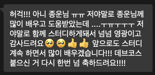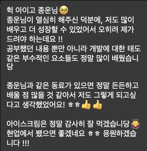 다들 항상 응원이 되는 좋은 말을 건네주신다. 위에 서론에서도 얘기했지만 이런 동료들이 있어서 더욱 더 열심히 공부하고 잘 참여 할 수 있지않았나 생각한다. 6월 1일 오리엔테이션을 시작으로 본격적인 데브코스 과정이 시작된다. 해당 코스에서도 좋은 동료들을 만나서 또 성장 할 수 있는 나 자신을 그리는 중이다! 그리고 항상 주의를 하고 있는 것은 종종 나 자신은 열정이 너무 과할 때가 있는데, 이게 장점이기도 하고 단점이기도 하다. 종종 열정에 잡아먹히기 때문에... 나 자신에 대해서도 돌아보며 꾸준하게 성장하도록 잘 살펴야겠다.