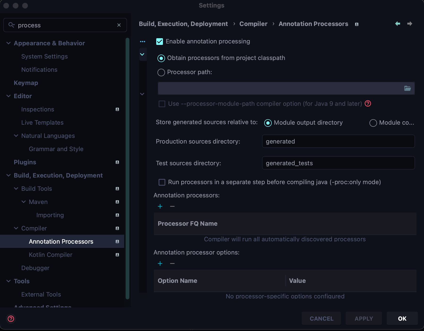 두 번째로는 Annotation Processors 에서 Enable annotation processing이 체크가 되어있는지를 확인했는데 체크가 안 되어있음을 확인 할 수 있었다.