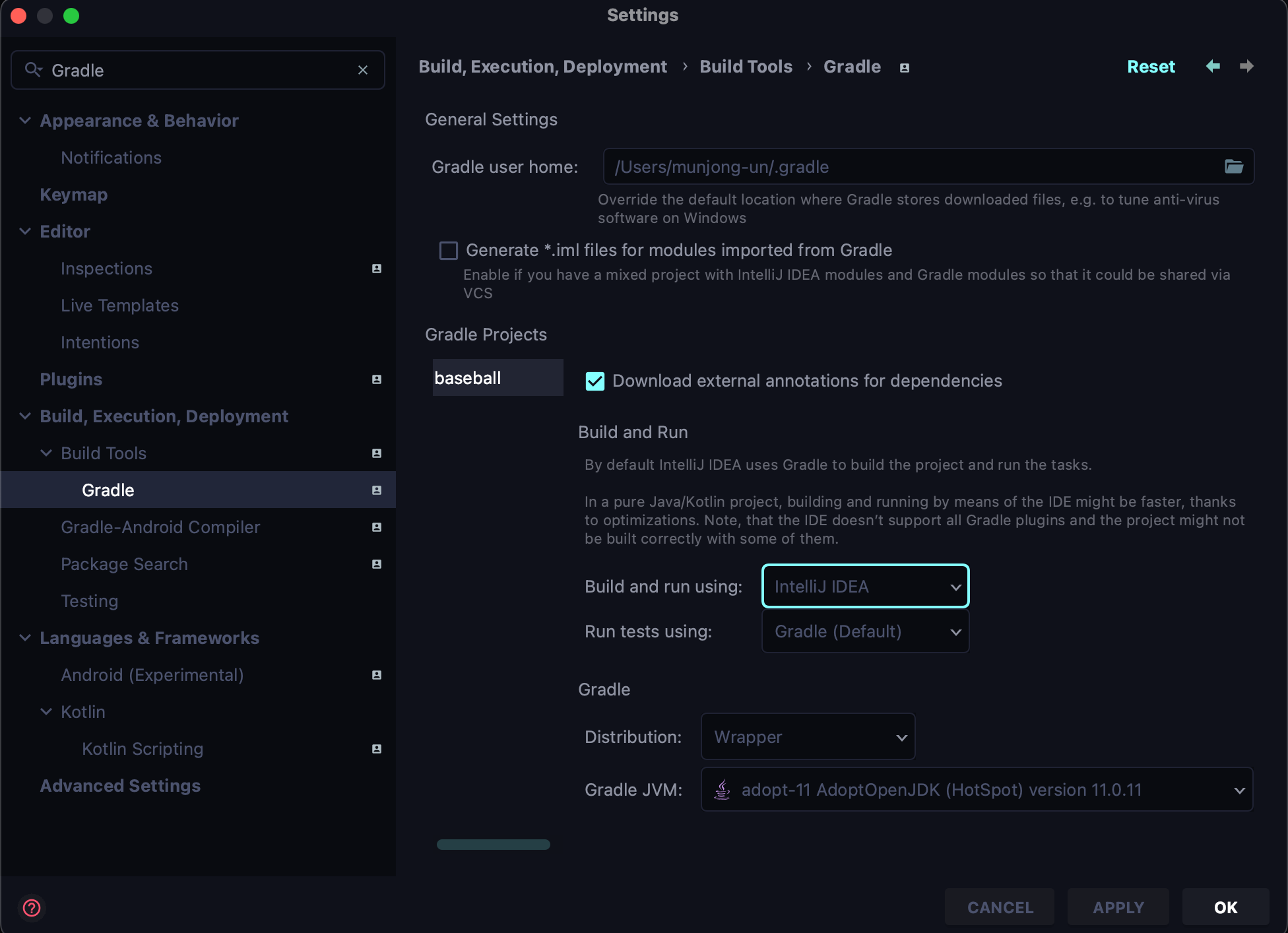 해당 영역을 체크하고 나서도 동일한 오류가 발생하였다. 혹시 몰라서 Build Tools 를 Intellij 로 변경해봤다.