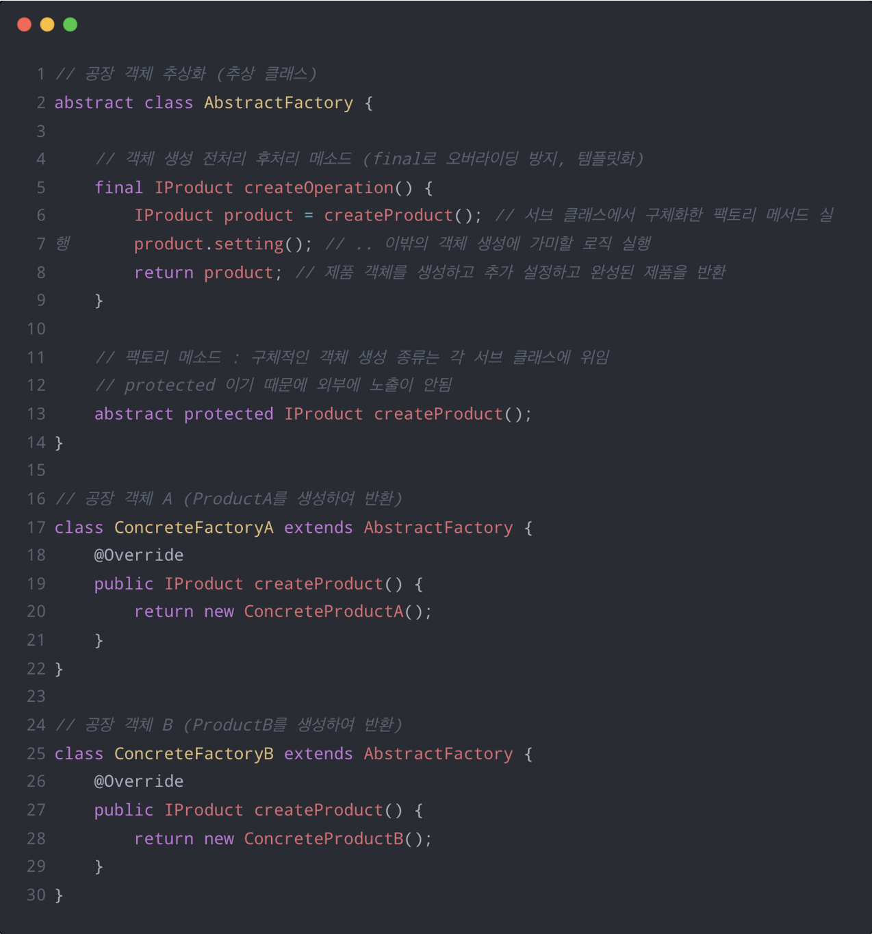 팩토리 메서드 패턴은 추상 메서드를 통해서 객체 생성에 있어서 전처리와 후처리를 해줍니다. 즉, 무거운 객체를 생성 할 때 동일한 어떠한 작업들을 각각의 구상 클래스들에 따라 다르게 생성하는 방식입니다. 추상 팩토리는 다양한 타입의 제품 군을 한데 묶어서 생성하는 방식입니다.