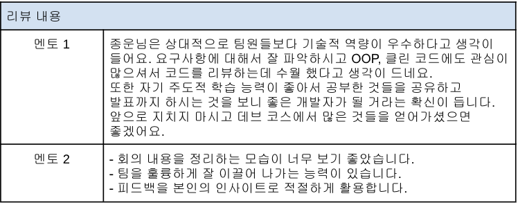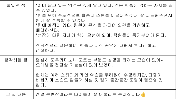 2주 기간의 Pre팀 기간이 끝나고, 새로운 New팀으로 배정이 되었다. 리더십이 뛰어나다고 생각하지는 않지만, Pre팀 2주 기간동안 진행했던 팀원과 멘토님들의 피어 리뷰를 받게 되었는데 정말 좋은 얘기들이 있었다.