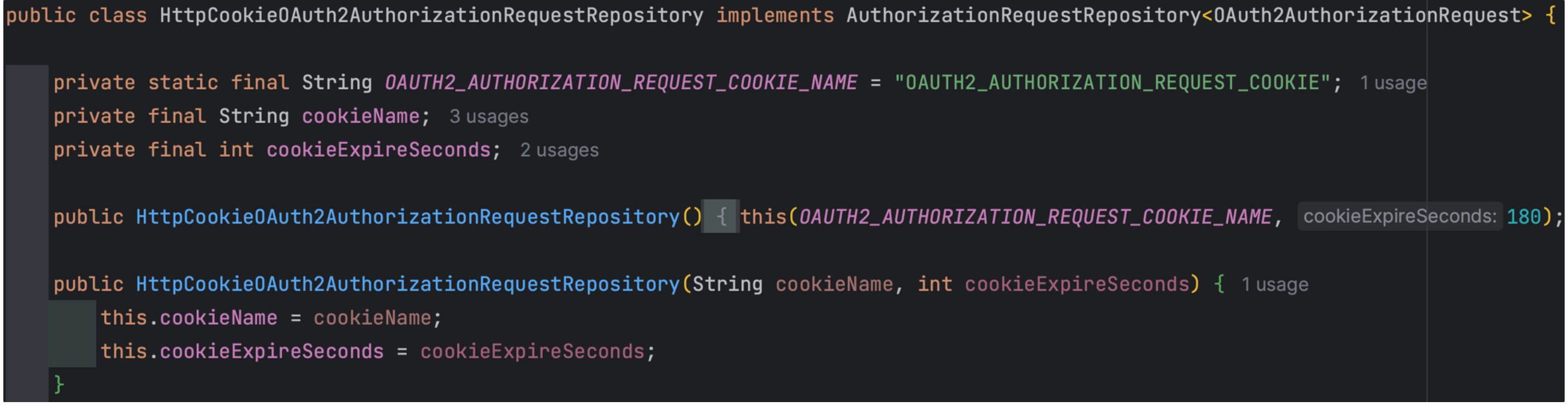 다음과 같이 Cookie를 통하여 인증 상태를 유지시키도록 하기 위해 AuthorizationRequestRepository를 구현하였다.